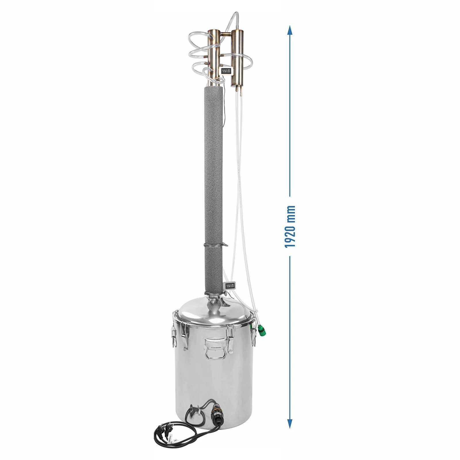 Täiskomplekt – komplekt sisaldab kuplikujulise kaanega konteinerit, tagasivooluga kolonni, kondensaatorit, kuulventiili, 2 elektroonilist termomeetrit sondidega, 2 voolikut, veeühenduse ühendusdetaili, 2 komplekti Tri-Clamp klambreid tihenditega, roostevabast terasest täidist, teflonlindiga tihendusmaterjali, kinnitusdetaile ja juhiseid.