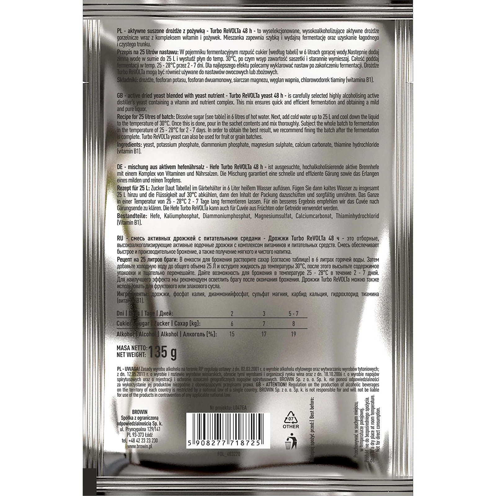 25 l partii puhul piisab ühest 135g pakist Turbo reVOLTa destilleerimispärmist.