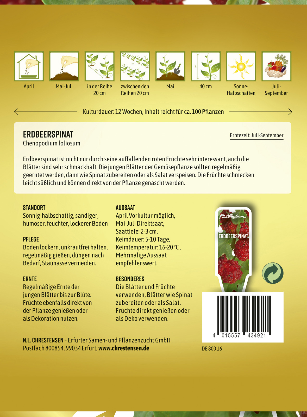 Chenopodium foliosum Maasikspinat on tuntud ka mimega Ere marjamalts. Dekoratiivse välimusega taimel moodustuvad lehekaeneldes punased, maasika kujulised viljad, mis on söödavad. Toiduks sobivad ka noored lehed, mis maitsevad nagu spinat. Taime noori lehti tuleks regulaarselt koristada, seejärel tarvitada nagu spinatit keedetult või värskena salatites. Marjad maitsevad magusalt ja neid võib süüa otse taimelt. Taime kasvukõrgus 40 cm. Pakis ca 100 seemet.
