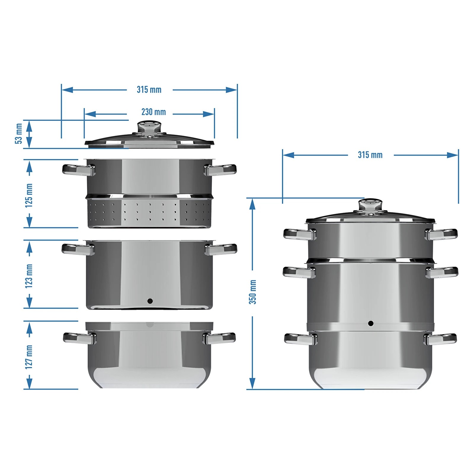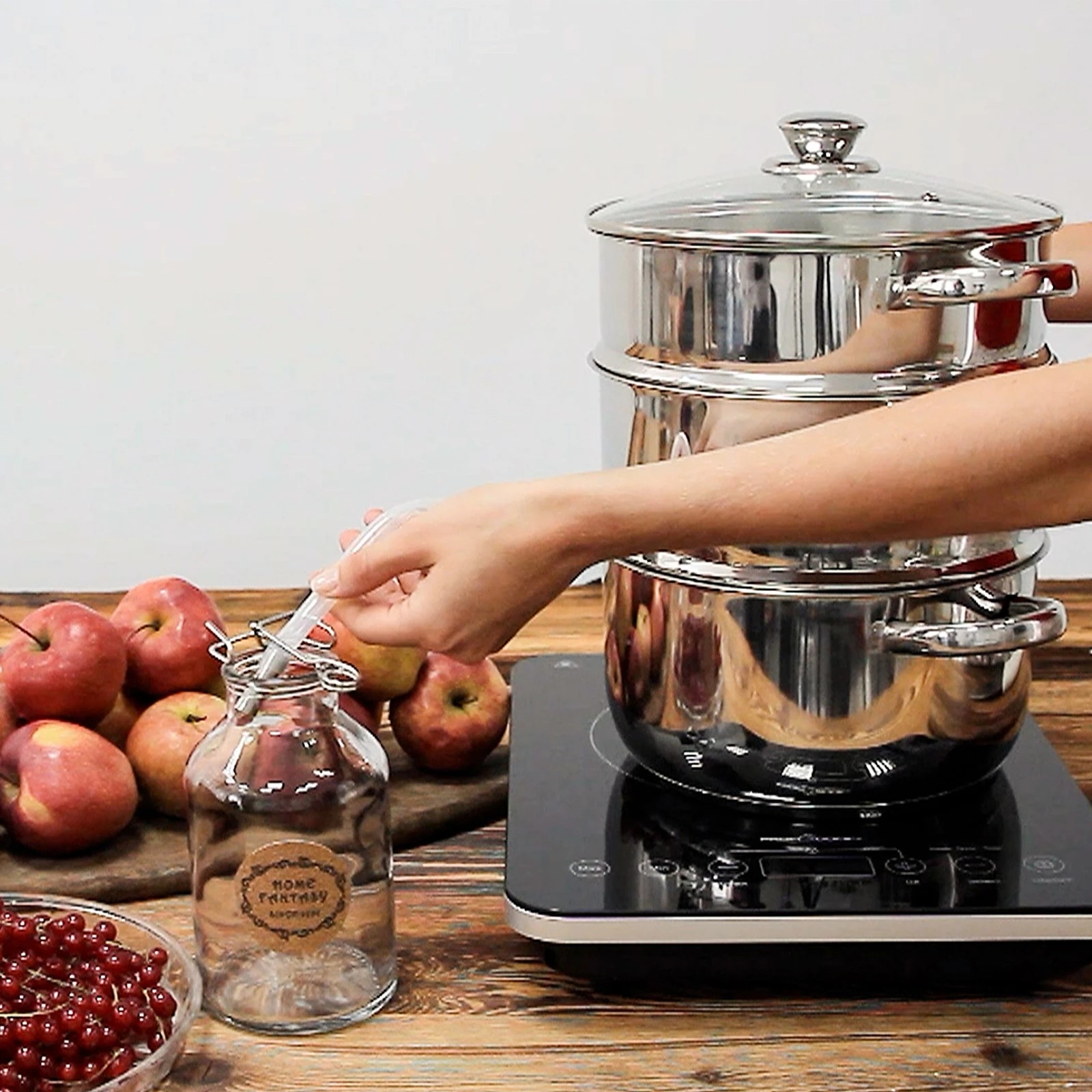 Mugav kasutamine – mahlapress on mõeldud kasutamiseks igat tüüpi pliidiplaatidel. Komplekti ettevalmistamine on väga lihtne – piisab kolme mahuti õiges järjekorras virnastamisest. Valmis mahla saab lihtsalt otse pudelitesse või purkidesse valada tühjendusvooliku abil.