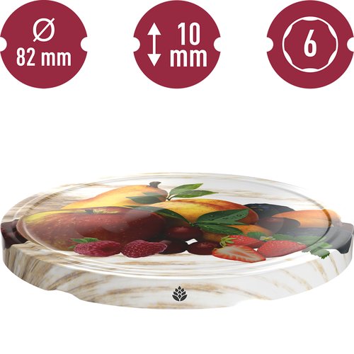 Puuvilja motiiviga keermega purgikaas. Läbimõõt 82 mm.