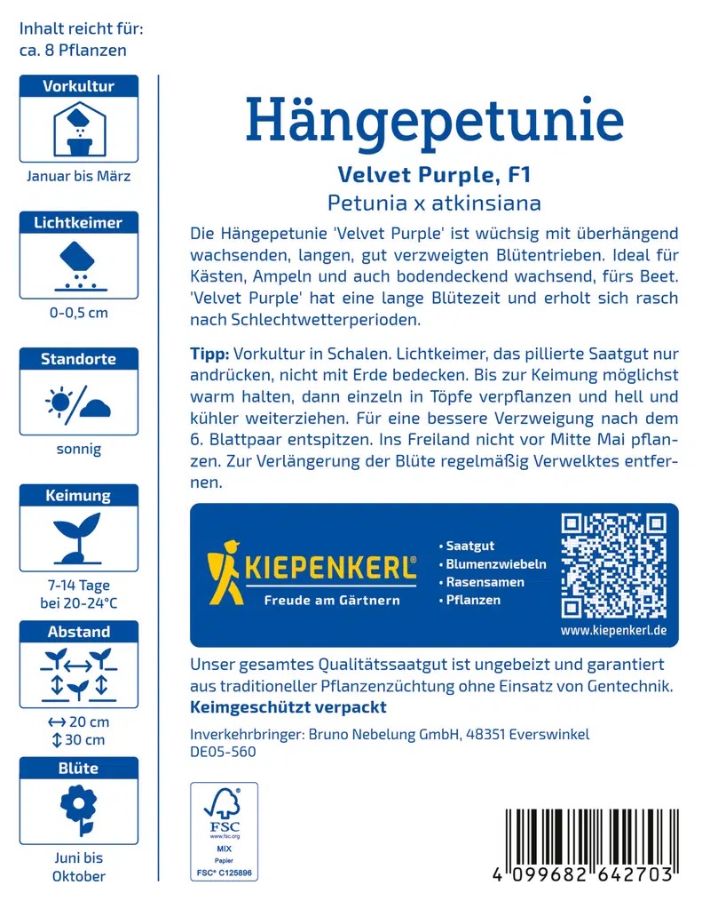 Velvet F1 on parim ripp-petuunia sordirühm mida saab kasvatada seemnest. Tugeva kasvuga sort, mis on väga vastupidav ilmastikutingimustele. Kiire kasvuga ja õiterohke ning sobilik kasutamiseks haljastuses. Õitseb väga massiliselt purpursete õitega. Tuulega isepuhastuv, rippuva kasvukujuga, sobib amplisse, potti, lillepüramiidi. Ei vaja pintseerimist. Õitseb rikkalikult kevadest esimeste öökülmadeni. Võrsete pikkus 80 – 100cm.