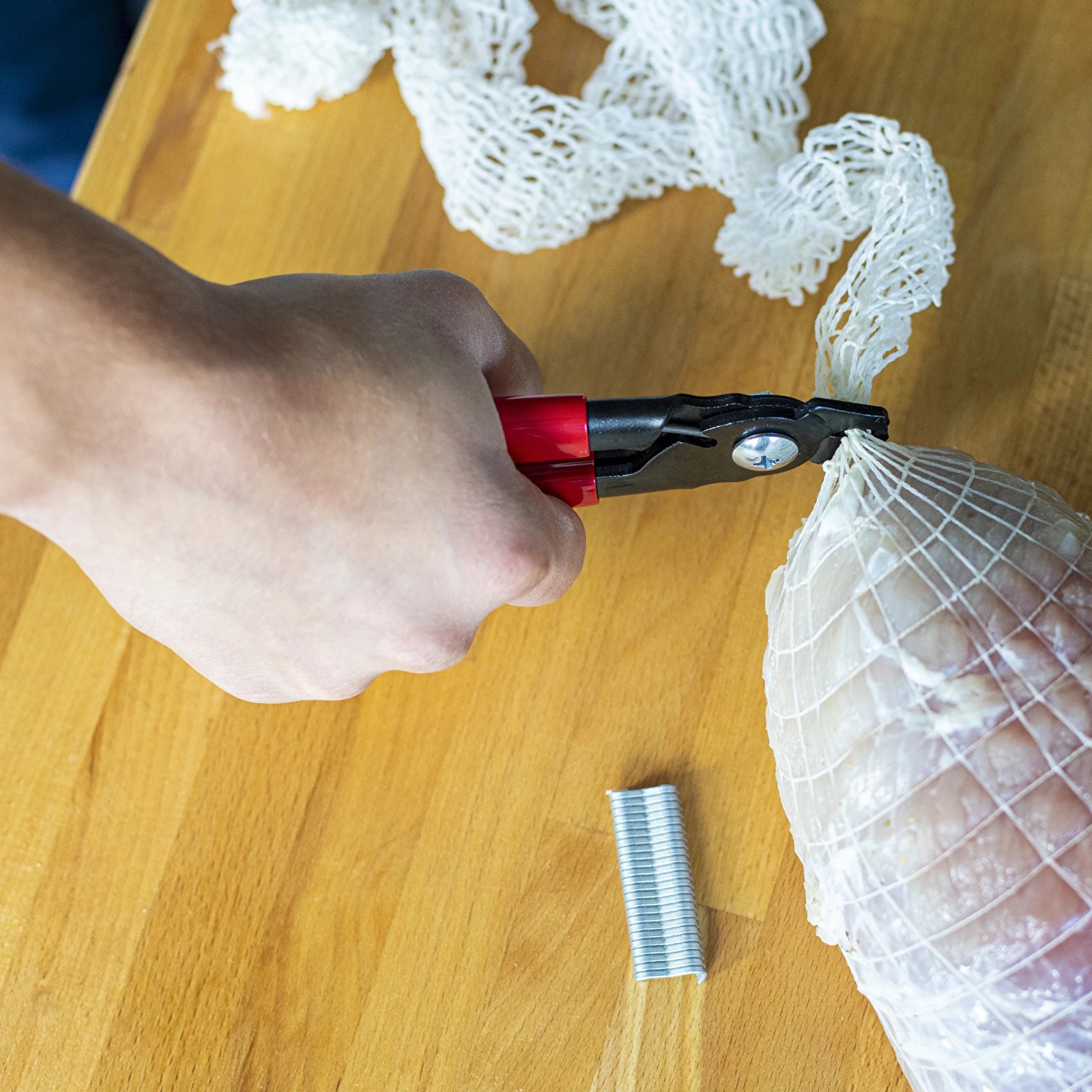 Asetage klamber tangide otsas olevasse süvendisse ning seejärel tangid koos klambriga vorsti/singikesta või võrgu valitud kohta ja vajutage tangid ning klamber lõpuni kinni. Kui klamber on paigas, avanevad tangid automaatselt, et võimaldada uue klambri paigaldamist.